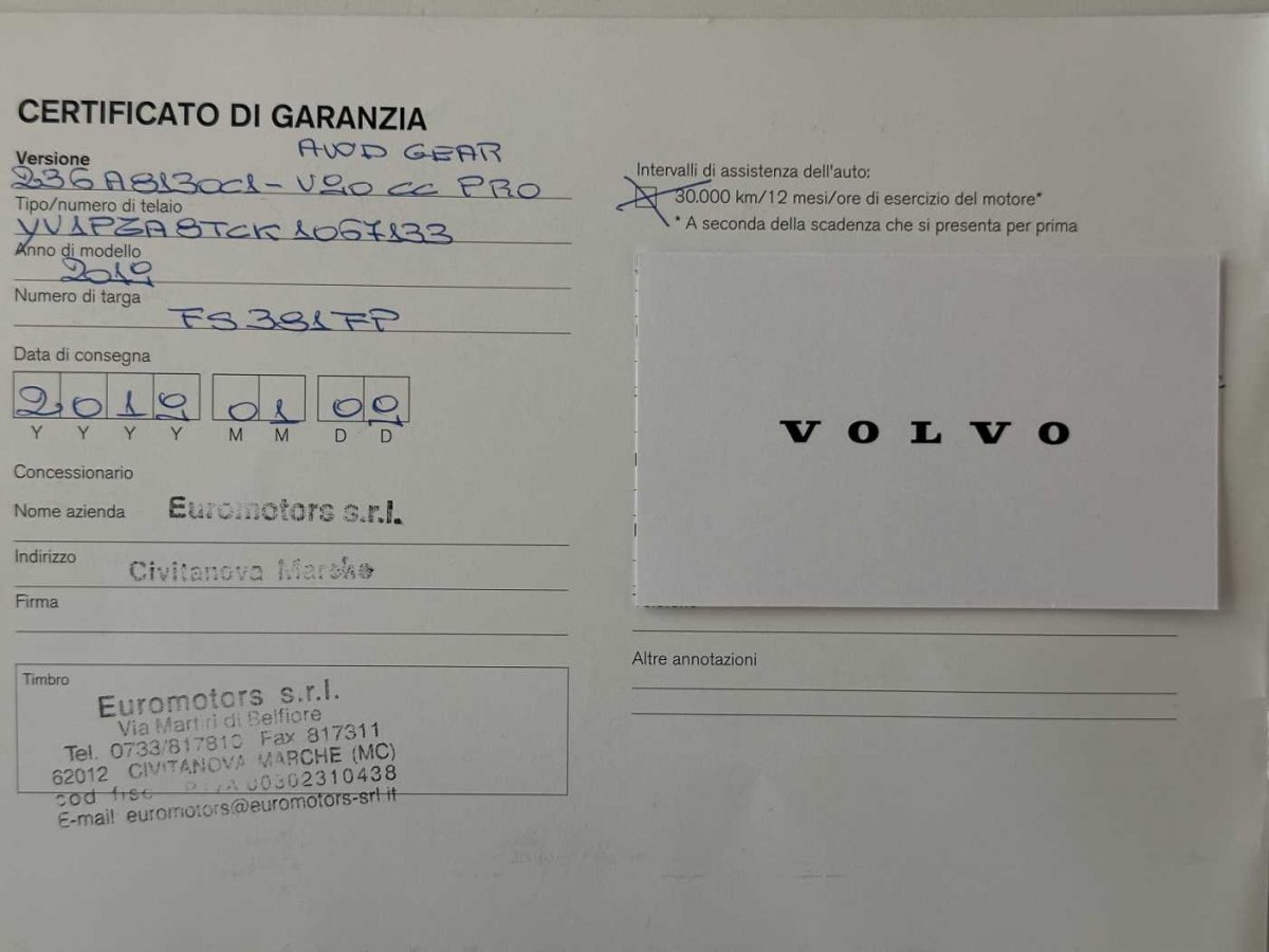 | Unico proprietario, tenuta molto bene. Acquistata presso la nostra concessionaria. La manutenzione è stata eseguita sempre puntualmente dalla nostra officina autorizzata Volvo. Garanzia legale 12 mesi più assicurazione sui guasti sempre 12 mesi. |